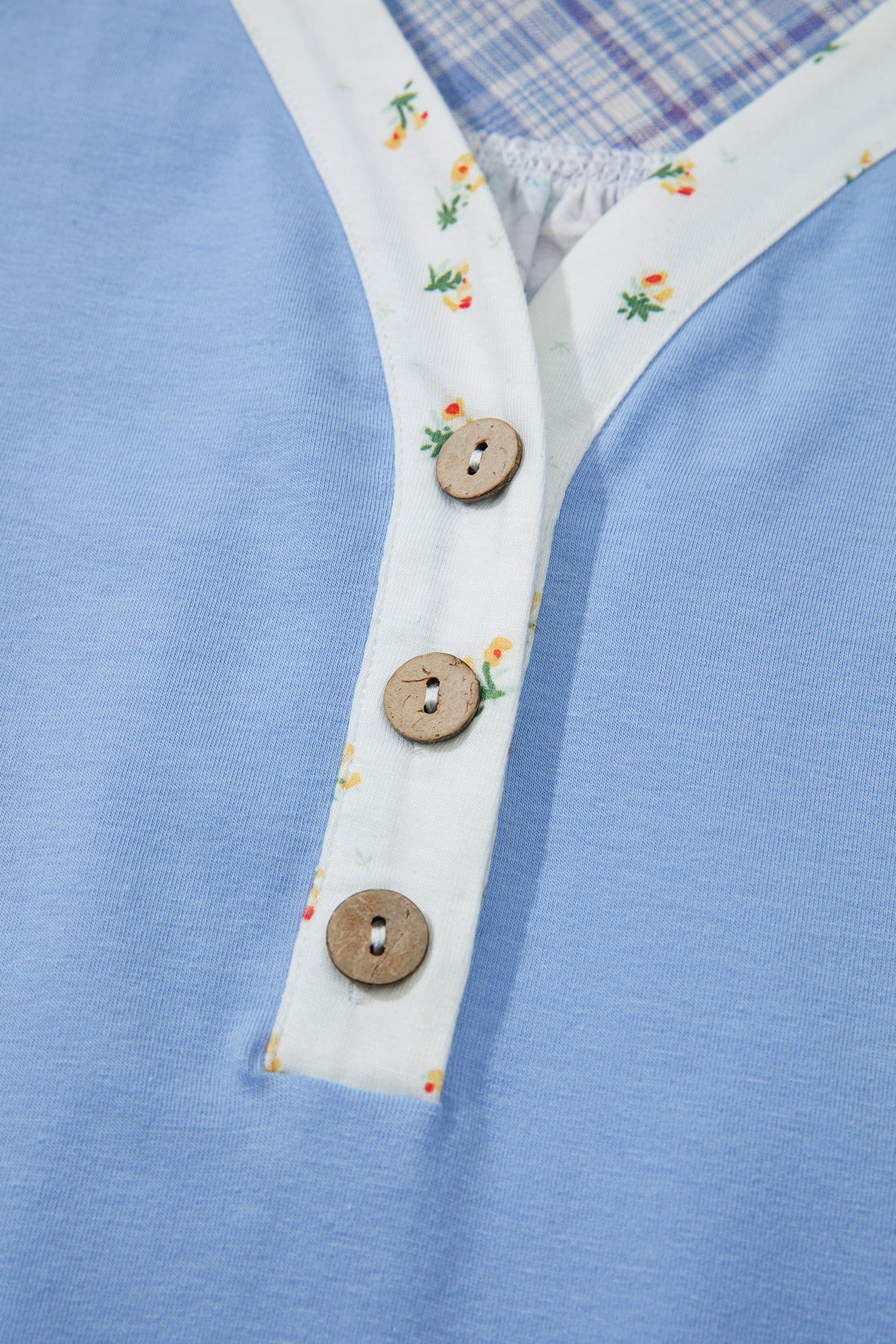 Elevate your everyday style with this charming blouse that effortlessly blends sophistication and fun. The relaxed fit flatters all body types, while the floral V-neckline adds a touch of romance. Plaid bubble sleeves bring playful femininity, and the patchwork color-block design creates an eye-catching statement. Front button detailing offers easy styling versatility. Perfect for dressing up casual outfits or adding personality to your work wardrobe. Polyester/Cotton/Spandex