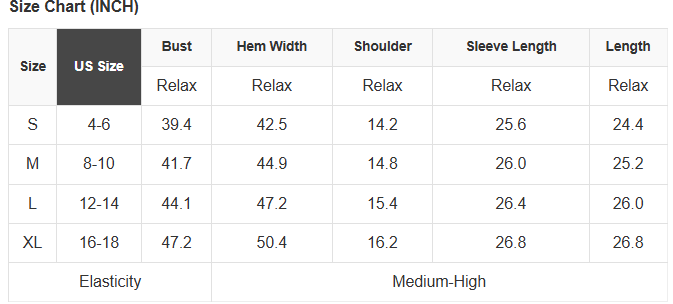 See size chart for approximate measurements.