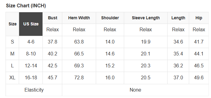 See size chart for approximate measurements.