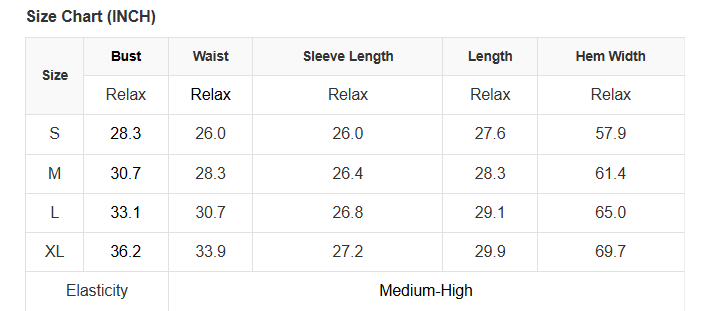 See size chart for approximate measurements.