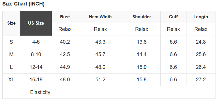 See size chart for approximate measurements
