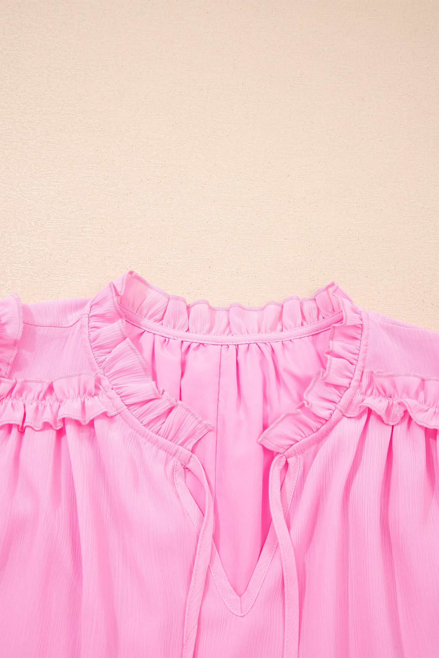 Elevate your summer wardrobe with this fabulous textured blouse that's totally on-trend! Featuring a chic V-neck with tassel tie detail, playful ruffled short sleeves, and a relaxed loose fit, this piece is all about effortless style. The soft, lightweight textured fabric drapes beautifully for a flattering silhouette that moves with you. Pair it with your favorite pants for an instantly polished look that works from brunch to evening plans. 100% Polyester