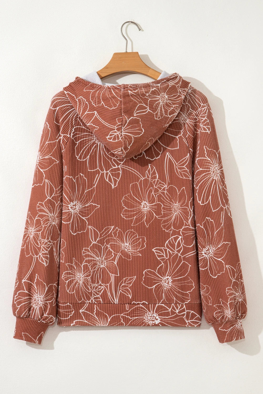 Floral Corded Knit Drawstring Kangaroo Pocket Hoodie