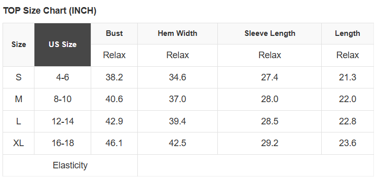 See size chart for approximate measurements.
