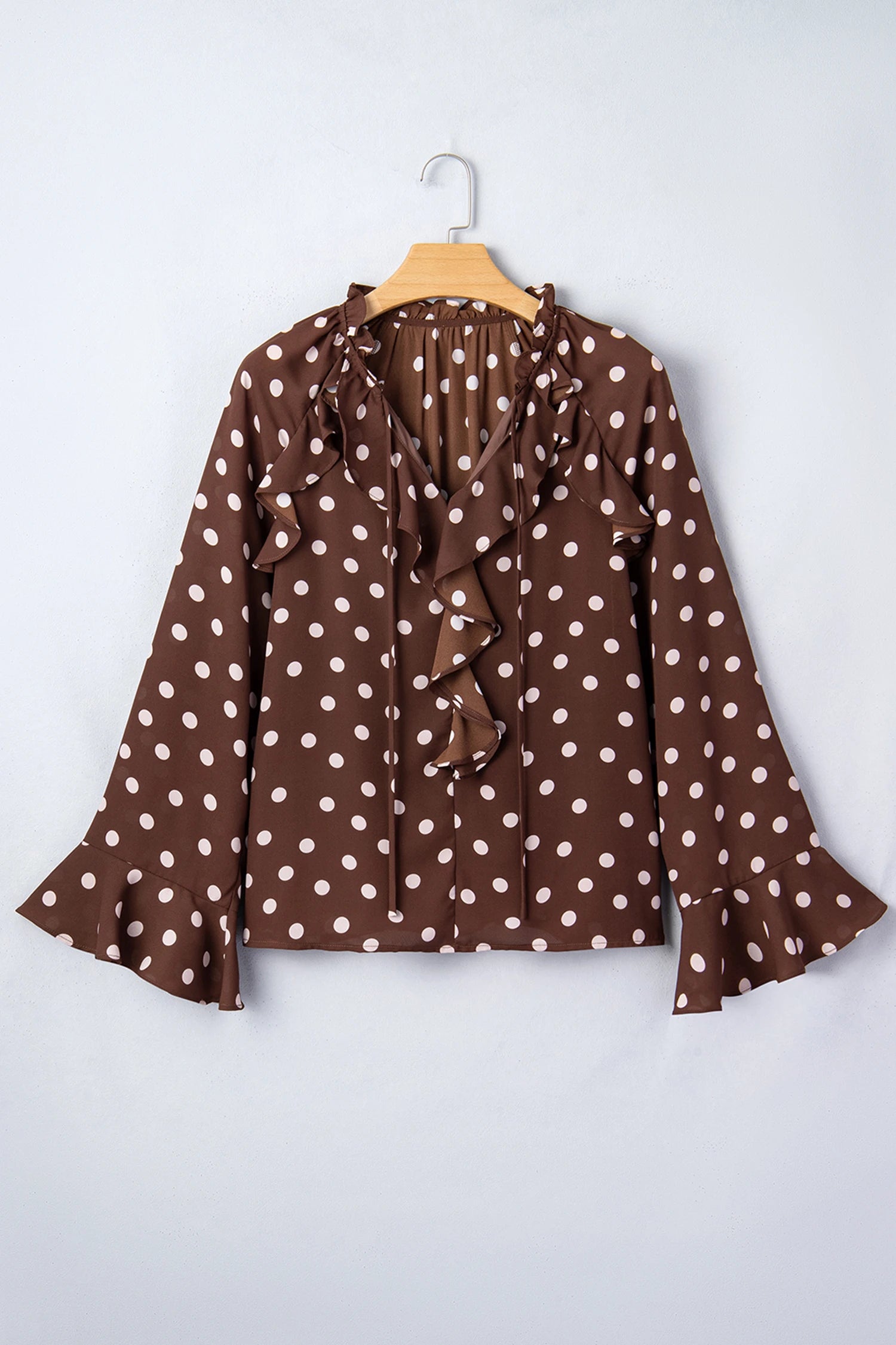 Polka Dot Ruffle Trim V-Neck Bell Sleeve Blouse