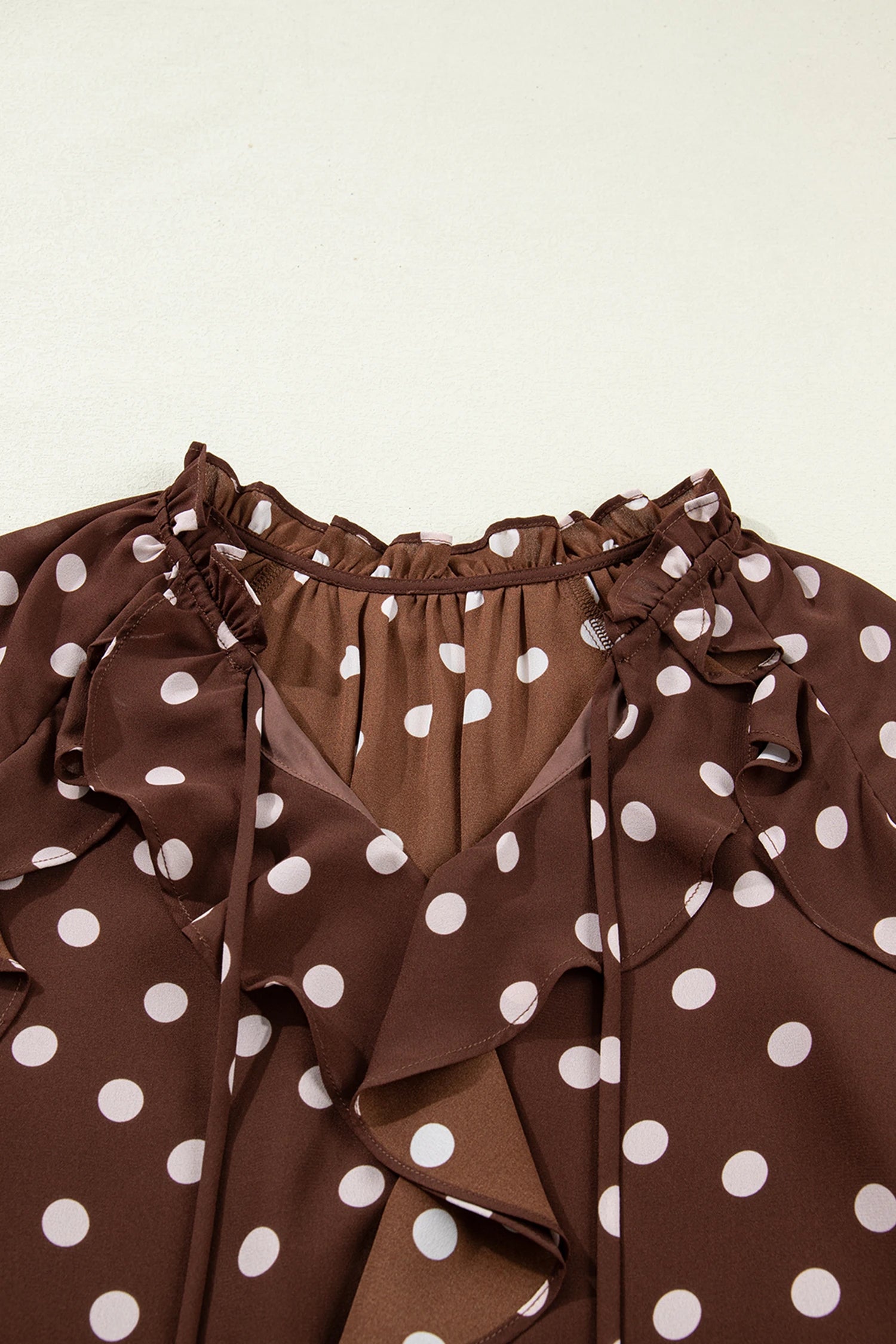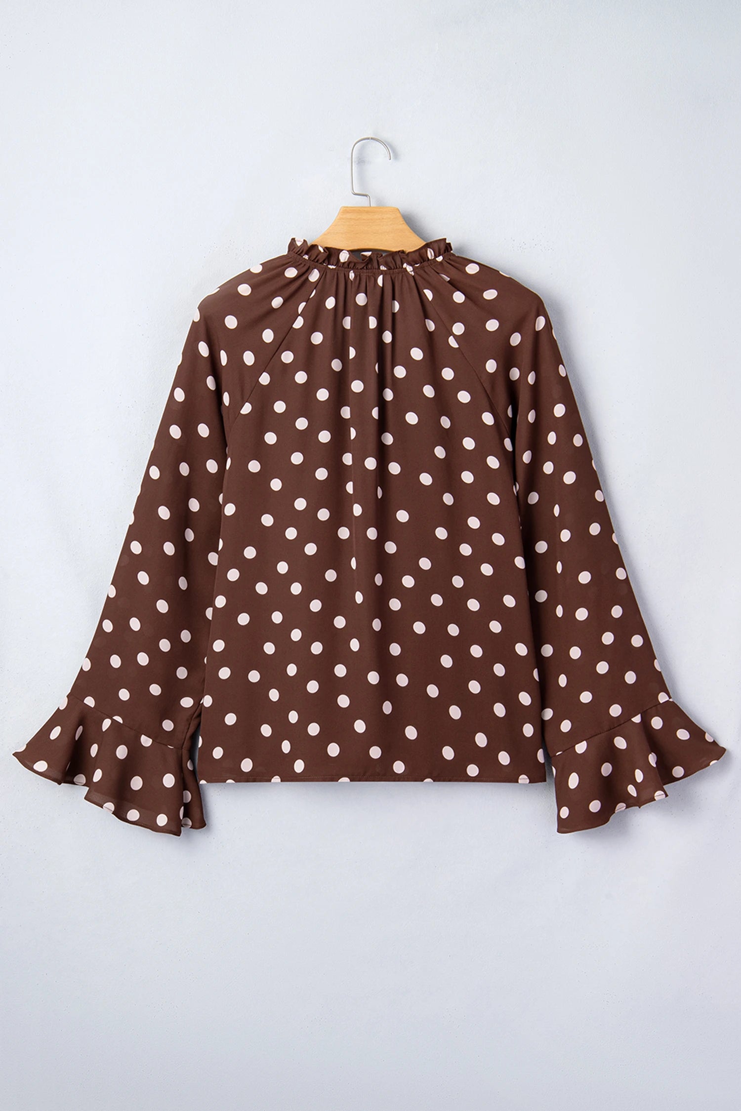 Step into spring with effortless charm in this polka dot blouse. Delicate ruffles frame the tie neckline while bell sleeves add a touch of whimsy to your everyday look. Crafted from breathable chiffon, this lightweight beauty drapes beautifully and feels as good as it looks. Whether you're dressing up for brunch or keeping it casual, this versatile piece brings timeless style with a playful twist. Perfect for layering through the seasons. 100% Polyester