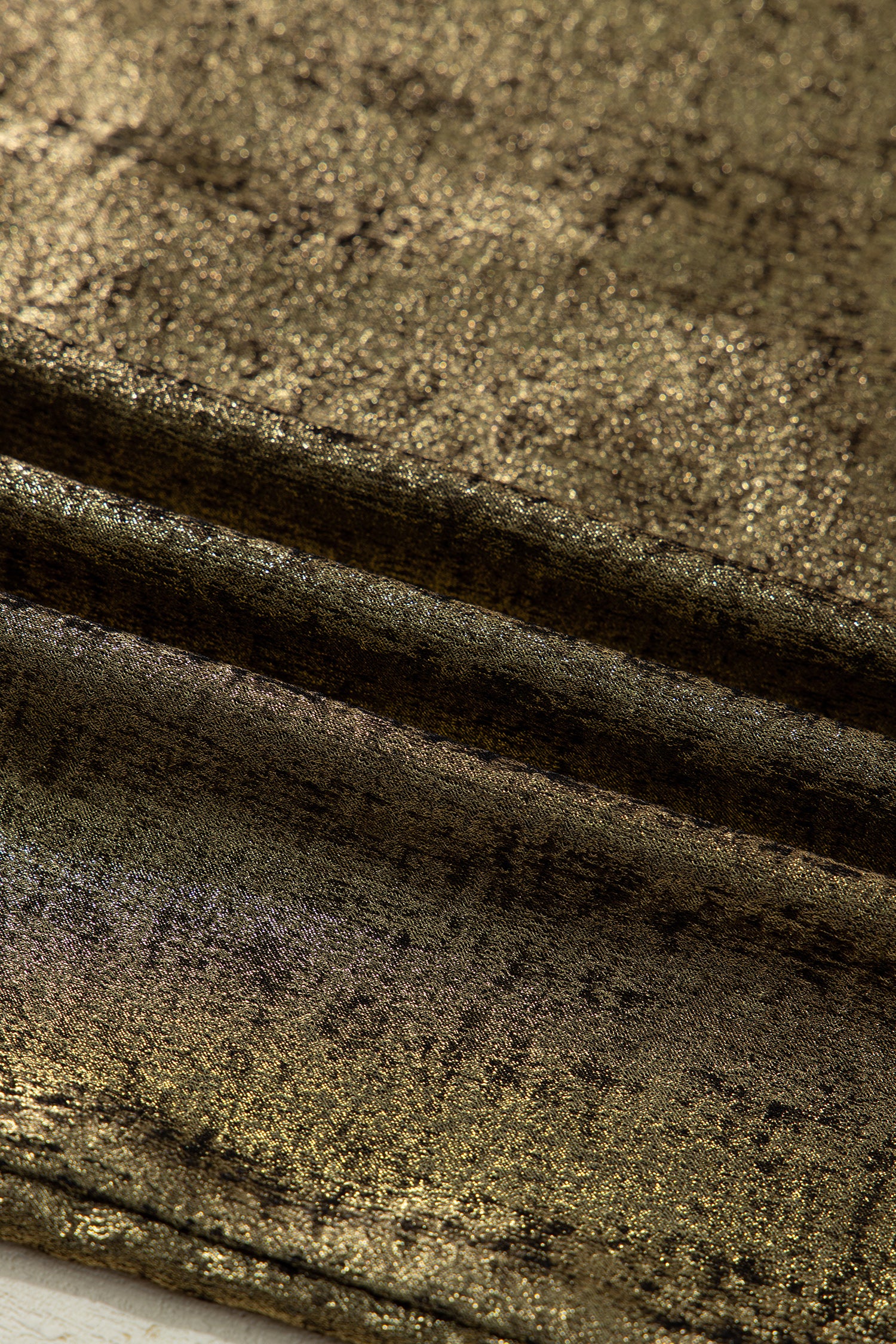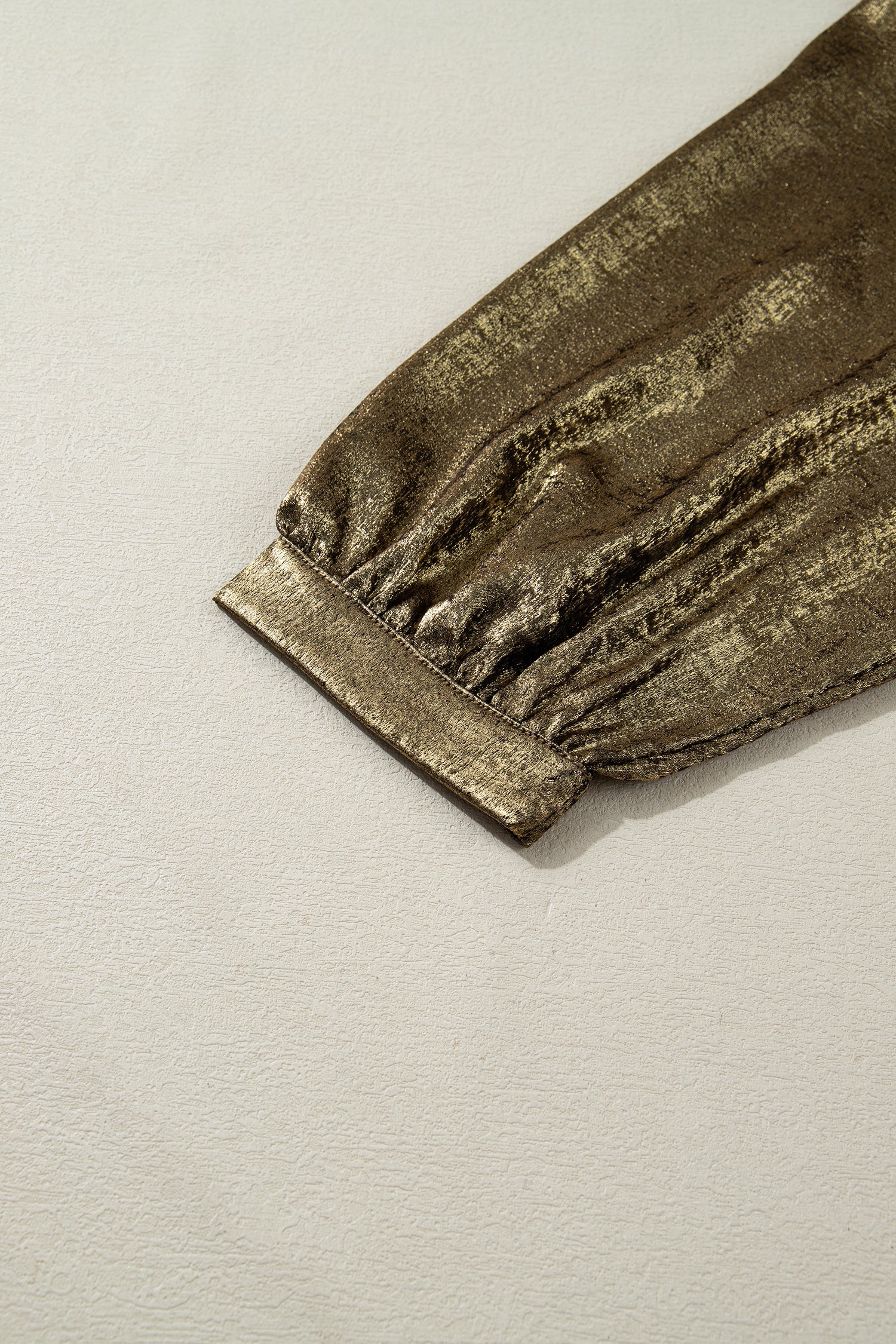 Elevate your date night with this stunning metallic blouse that catches every light in the room. The shimmering fabric creates an eye-catching sparkle, while the graceful split neckline and three-quarter sleeves add feminine sophistication. Style it with faux leather pants for an edgy vibe or pair with a velvet skirt for romantic elegance. Perfect for date night or any occasion where you want to shine. 100% Polyester