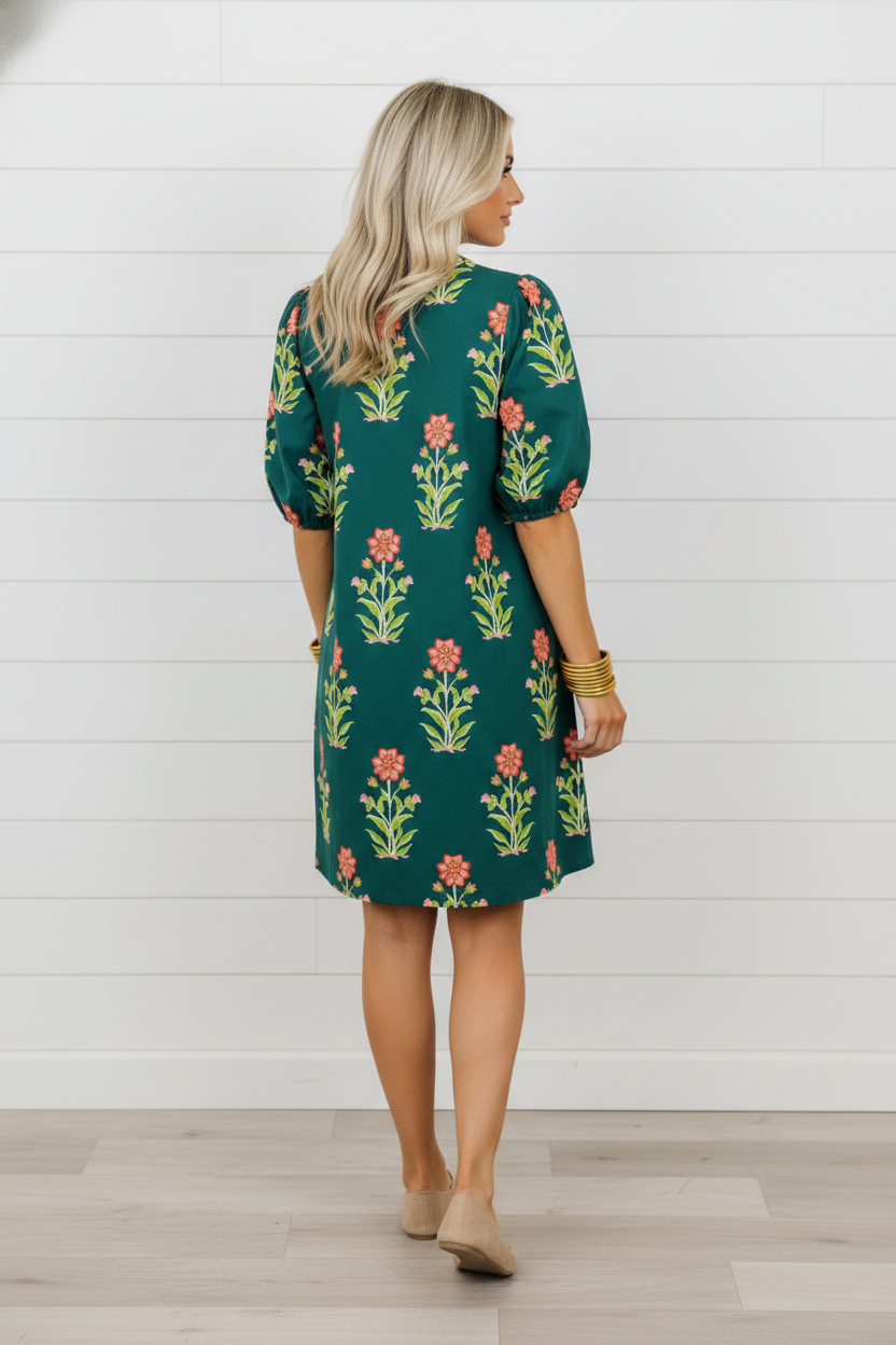 Embrace effortless style with this charming floral dress that combines comfort and personality. The relaxed fit flatters your figure while keeping you cozy all day long. A split neckline trimmed with contrasting stripes adds an unexpected twist, while delicate puff sleeves bring out your feminine side. Perfect for casual outings or weekend adventures, just slip on your favorite boots or sandals and you're ready to go! Cotton/Viscose