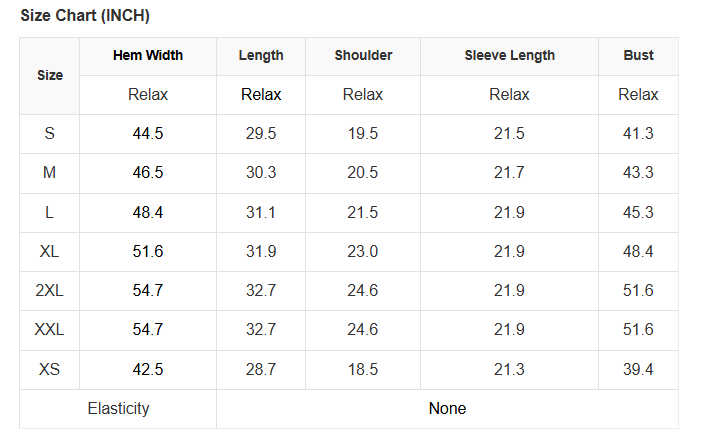 See size chart for approximate measurements.