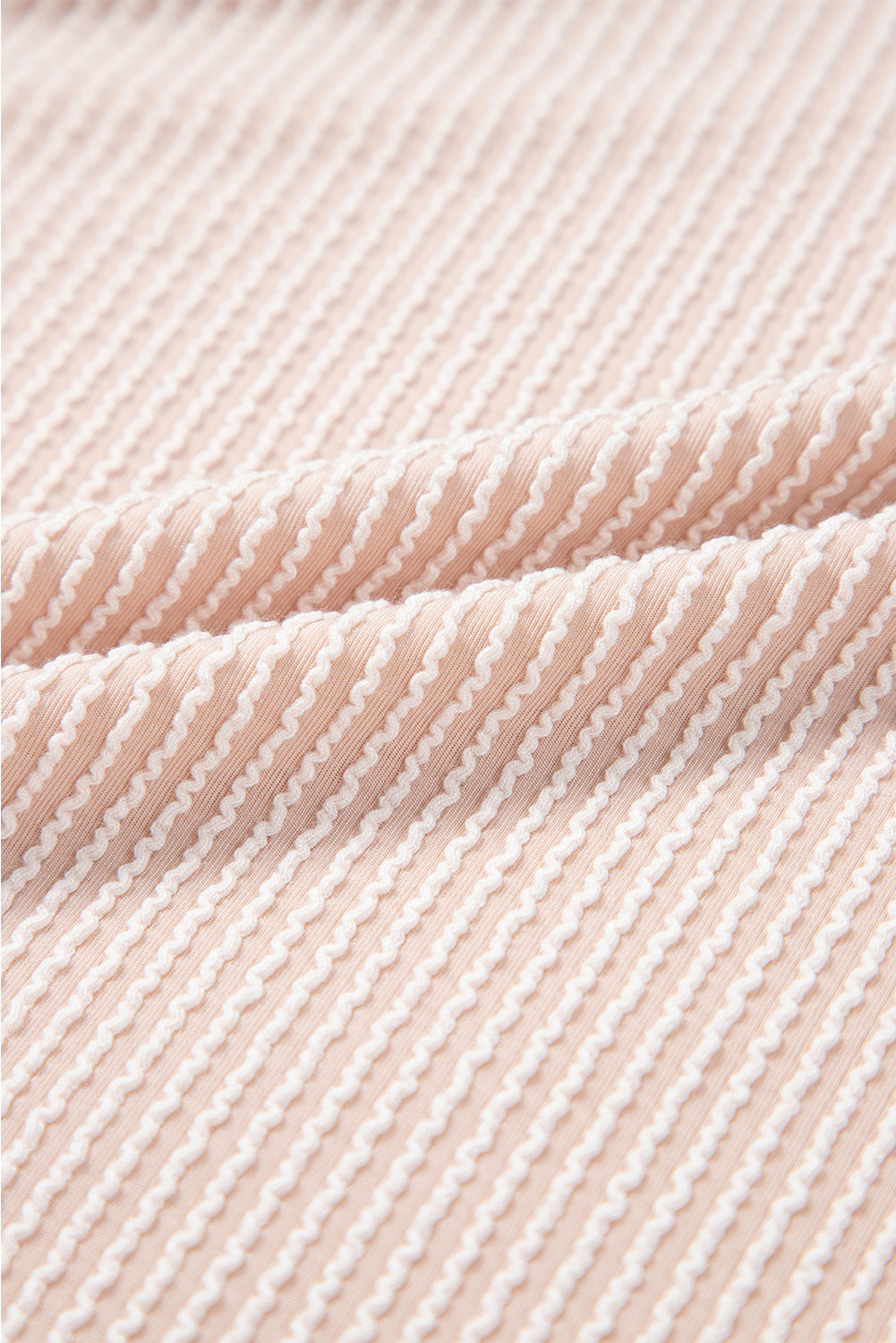 Turn heads with this playful two-piece set featuring a unique corded fabric that adds eye-catching texture. The elegant lantern sleeves bring a whimsical touch, while the high-waisted ruffled mini skirt defines your silhouette for a flirty finish. Perfect for effortless style that stands out. Polyester/Viscose/Spandex