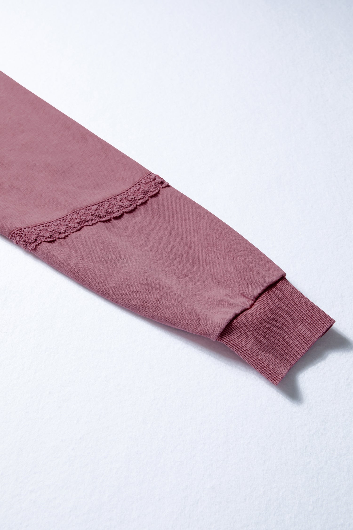 Cozy meets playful in this sweatshirt. The soft mineral wash fabric offers all-day comfort, while delicate lace patchwork adds a flirty touch. The unique notched neckline keeps things fun and fresh, making it perfect for casual days or layering up in style. Cotton/Polyester