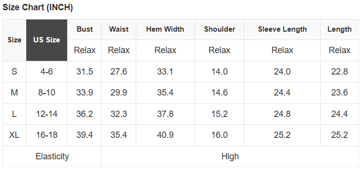 See size chart for approximate measurements.