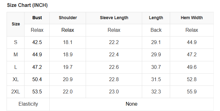 See size chart for approximate measurements.