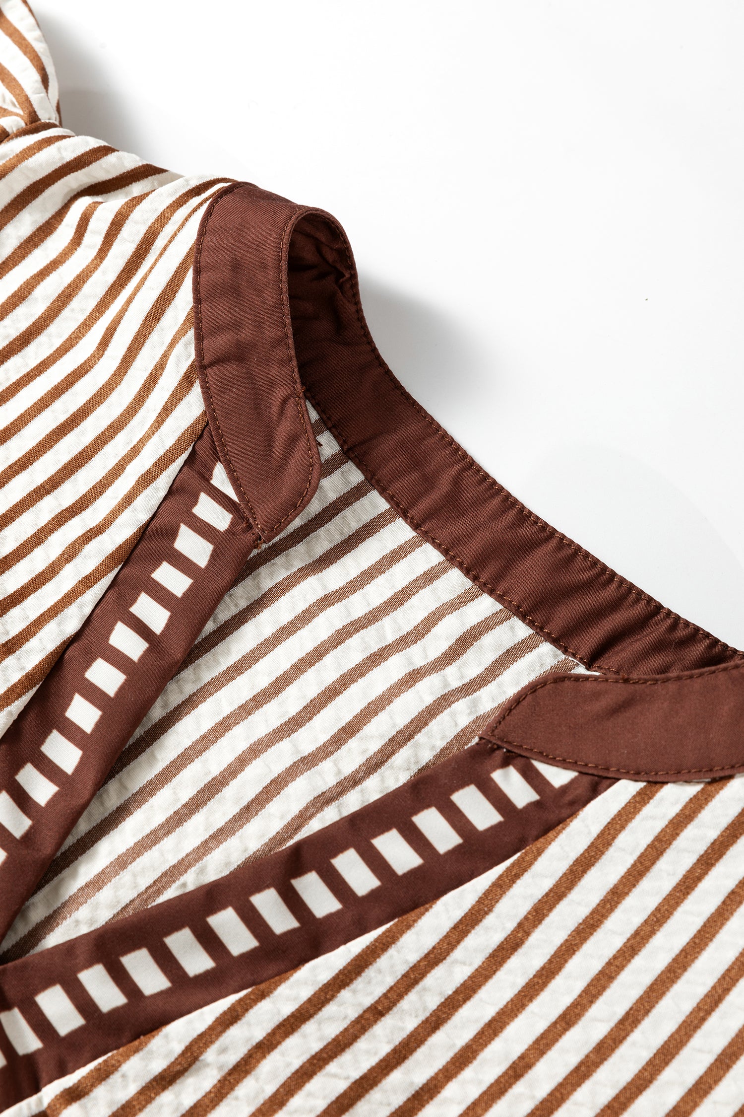 Elevate your warm-weather wardrobe with this charming blouse that effortlessly blends style and comfort. The crisp striped pattern delivers a fresh, modern aesthetic perfect for everyday wear, while double ruffled sleeves bring a playful, feminine flair that catches the eye. A flattering V-neckline creates an elongating silhouette that's universally flattering, and the lightweight, breathable fabric keeps you cool and comfortable all season long. Whether you're dressing up for brunch or keeping it casual, this versatile piece is your go-to for looking polished with personality. Polyester/Cotton/Spandex