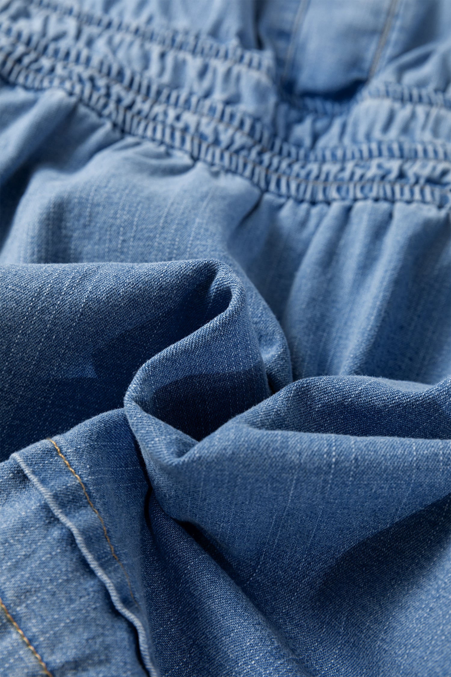 Slip into effortless cool with our denim mini dress, where comfort meets undeniable style. The elastic waist hugs you in all the right ways, giving you that perfect balance between relaxed and refined. Short sleeves keep things breezy, while contrast stitching at the hem adds a cheeky detail that elevates the whole vibe. Whether you're heading to brunch, a casual date, or weekend hangouts, this dress does the heavy lifting so you can focus on having fun. Flattering, comfy, and ready for anything. Cotton/Polyester/Spandex
