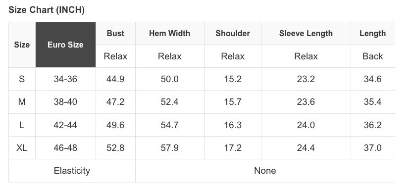 See size chart for approximate measurements