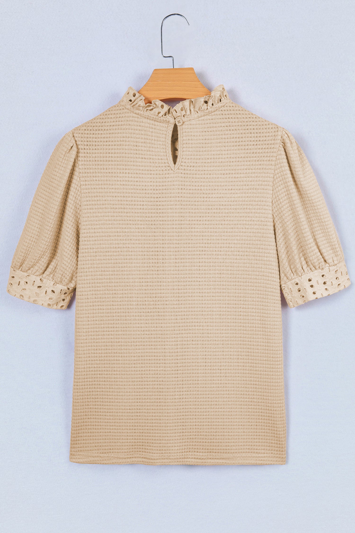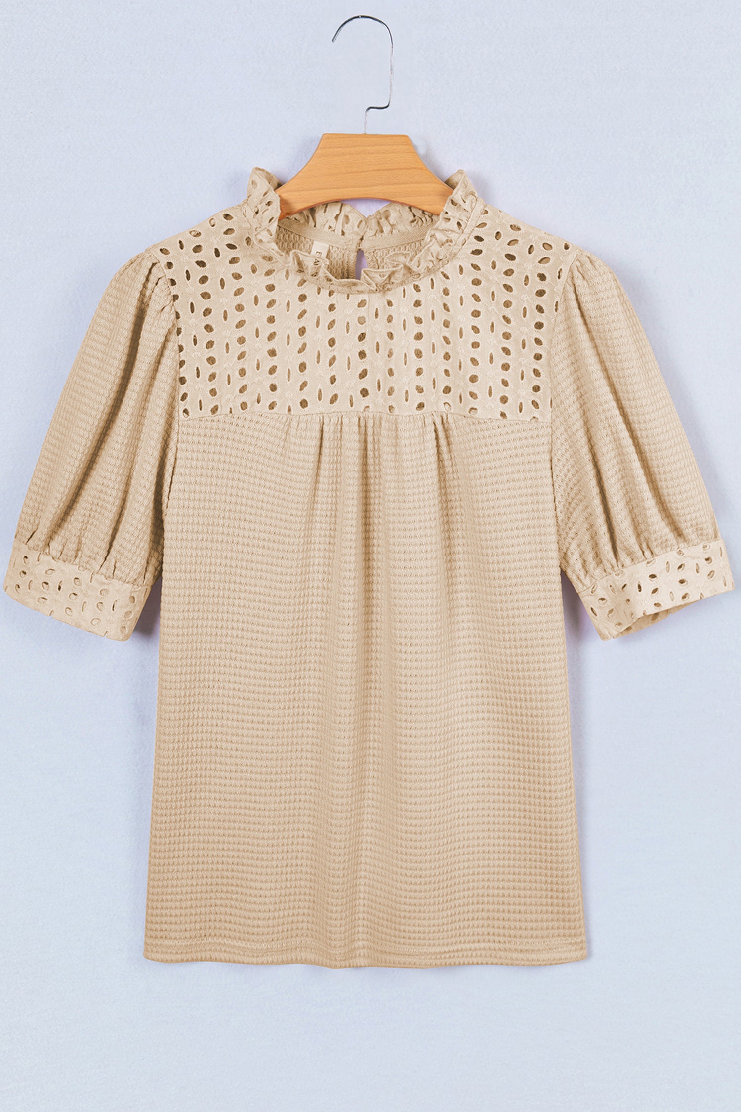 Mixing textures like a pro, this blouse pairs cozy knit with delicate eyelet embroidery for an effortlessly charming patchwork vibe. The ruffled neckline brings just the right amount of romantic flair, pretty without the pretense. Short sleeves keep things breezy and ready for anything, while the lightweight fabric skims your frame in all the right ways. Perfect for those days when you want to look put-together without actually trying too hard. Polyester/Viscose/Spandex