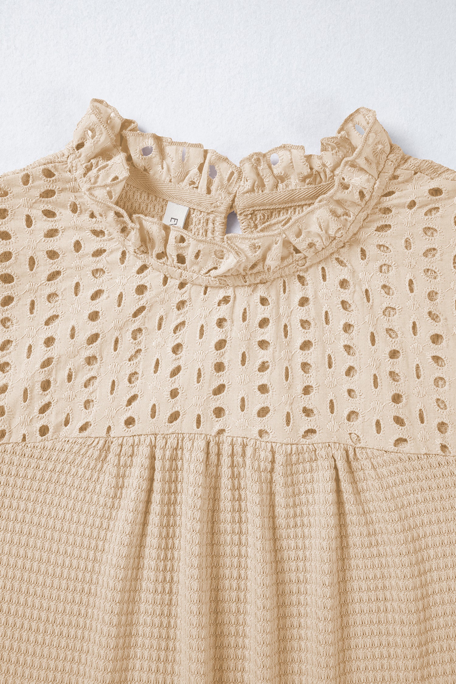 Eyelet Embroidered Patchwork Textured Ruffle Neck Blouse