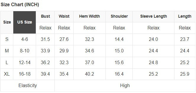 See size chart for approximate measurements.