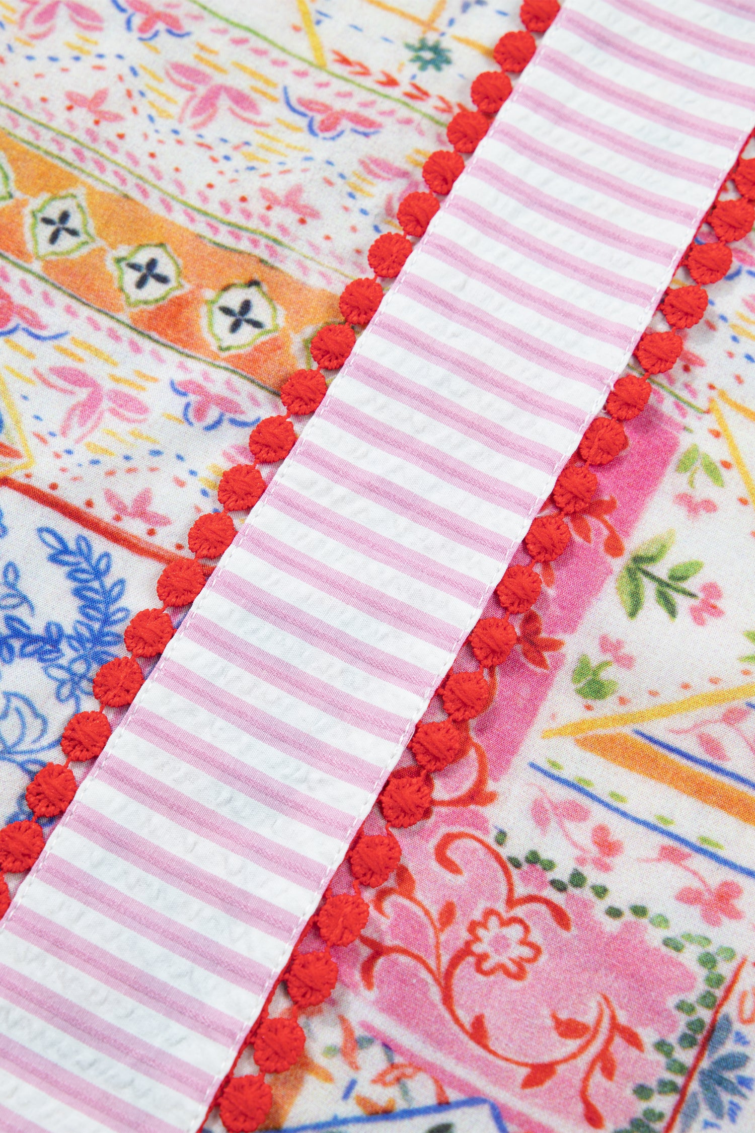 Turn heads this season in our Short Sleeve Blouse, a playful summer essential that combines bold style with comfort. The eye-catching mixed print design features vibrant patchwork fabric and a striking stripe accent along the collar and front. Delicate pom pom lace trim adds a whimsical touch, while the loose silhouette and raglan short sleeves deliver an effortless, breezy fit perfect for warm days. Whether you're heading to brunch or a casual outing, this blouse brings fun and flair to any summer wardrobe. 100% Viscose