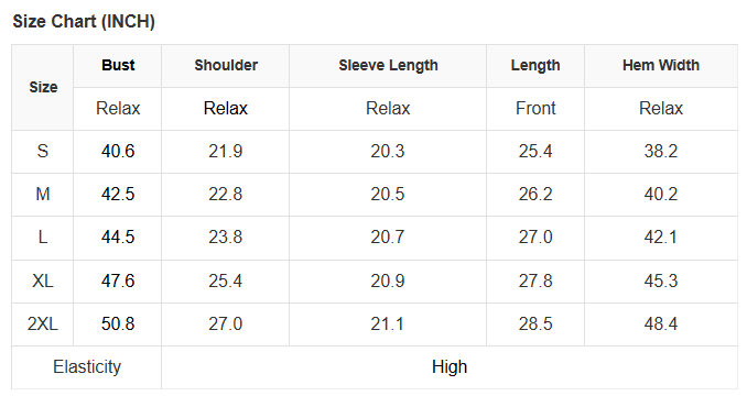 See size chart for approximate measurements.