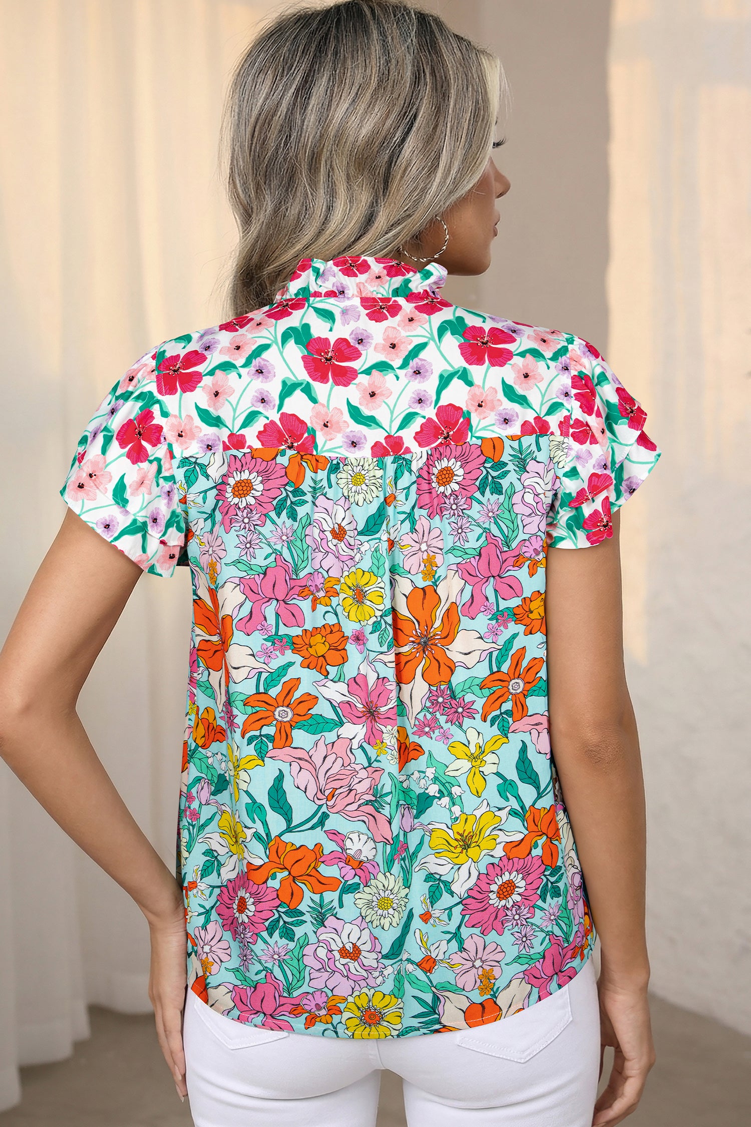 Floral Flutter Sleeve Split Neck Buttoned Blouse