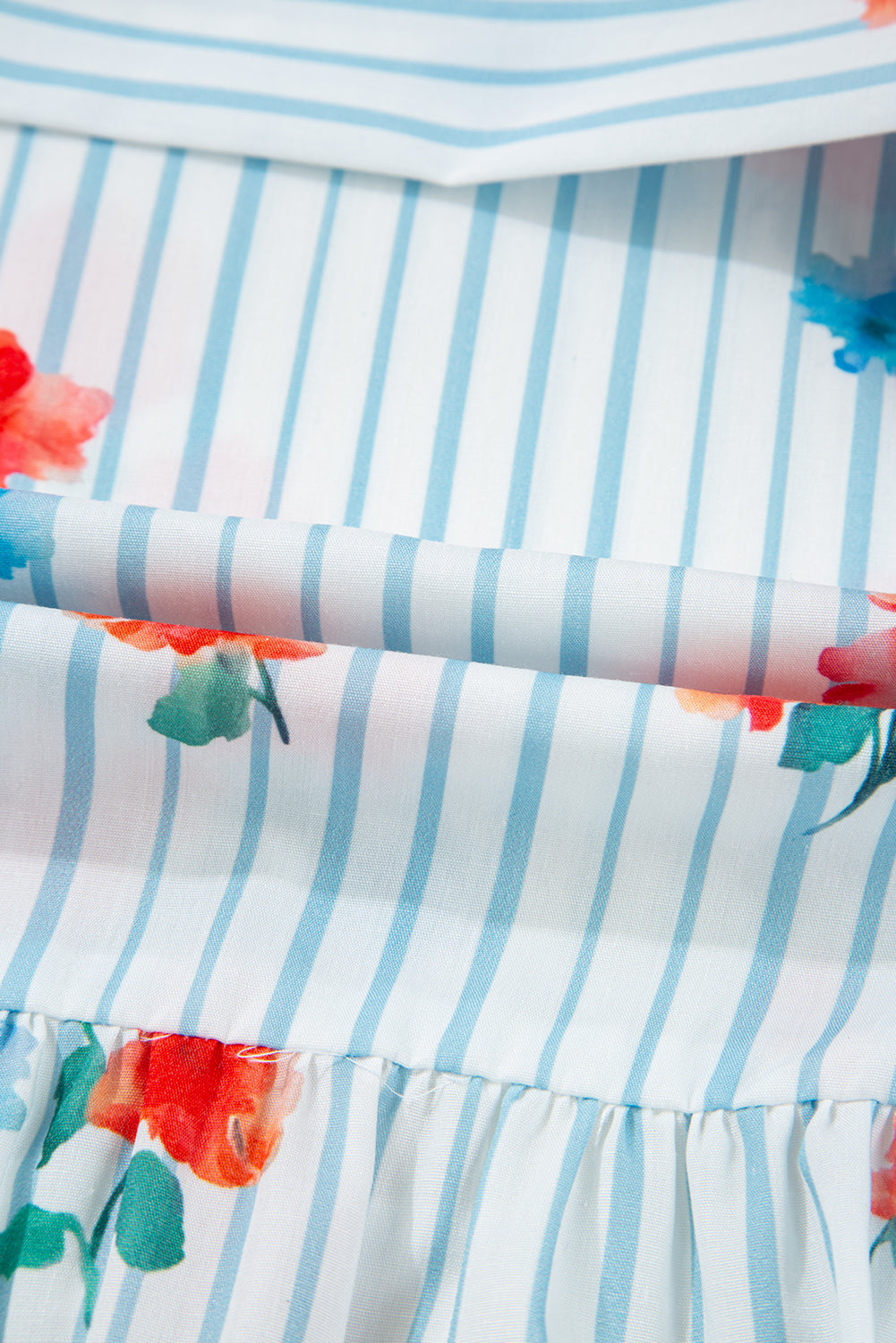 Stripe Floral Ruffle Sleeve Belted Mini Dress