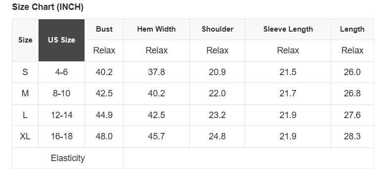 See size chart for approximate measurements.
